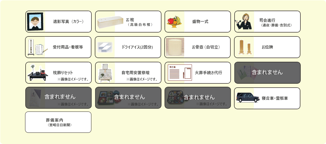 天国社は、ご家族でおこなう葬儀スタイルのご要望にも対応致します。 火葬式プランの内容 お棺 白布棺 ドライアイス 1回分 お骨壺 白切立 寝台車(10km未満) 病院・施設等へお迎えに伺います。 霊柩車 宮崎葬祭センター(火葬場)へお送り致します。 火葬手続き代行 火葬許可証発行手続きを代行致します。 >>プランに含まれないもの 火葬料、新聞広告、仮通夜使用料など。詳しくはお打合せの際にご確認ください。 *セットプランの為、不使用等があった場合でも減額は出来かねます。 *ハートフルメンバーズと ...