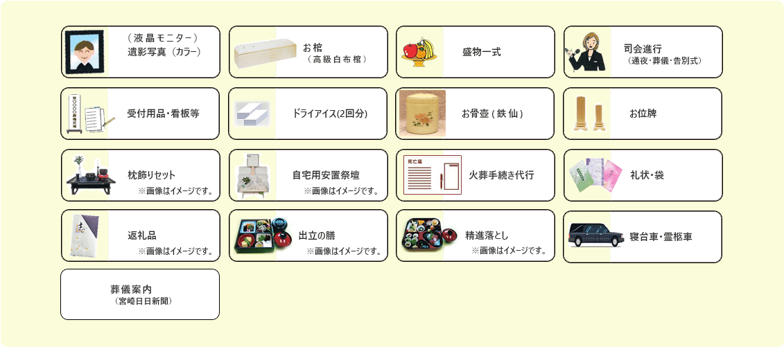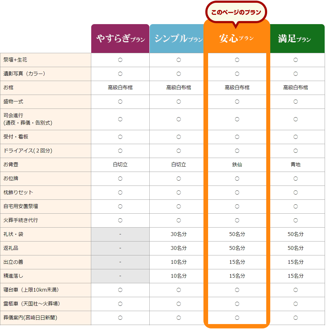 安心プランの内容 >>ご家族・ご親族・一般会葬者で行われるご葬儀を、低価格でご提供するプランです。 >>プランに含まれないもの 宗教者へのお礼・新聞広告・搬送用防水シーツ・火葬料・施行運営費・寺社お世話料・先導車・マイクロバス・夜間搬送料・料理・飲料奉仕料など、詳しくはお打合せの際にご確認ください。 天国社の葬儀プラン